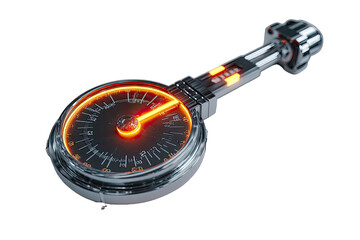 Close-up view of a modern speedometer with glowing red needle and black abstract background in a sleek technological design. 3D Rendering