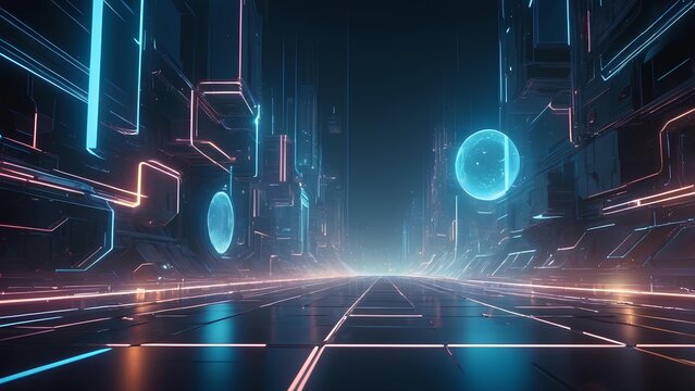 Perspective view of a futuristic digital corridor illuminated by vibrant neon circuit lines and floating data spheres