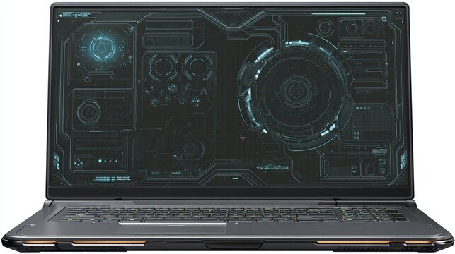Laptop display shows complex digital interface with circles, lines, and panels