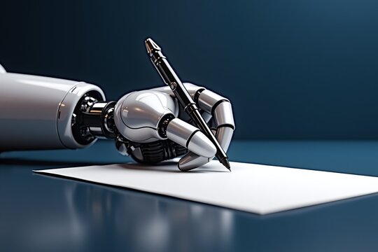 Metallic robotic hand writes on paper, sleek design, futuristic tech against dark background. Minimalist, precise motion captured in still life.