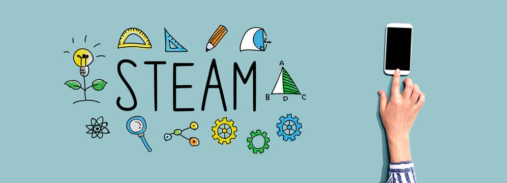 STEM Education Concept. Science Technology Engineering Math Learning and Training School Technology. Student offers stem gear icon on virtual screen. Research E-Learning Technologies.