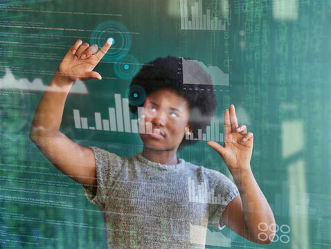 Hologram, virtual panel or business black woman typing on stock market dashboard, graph or economy analytics. Future data analysis, matrix code digital transformation or African trader trading crypto