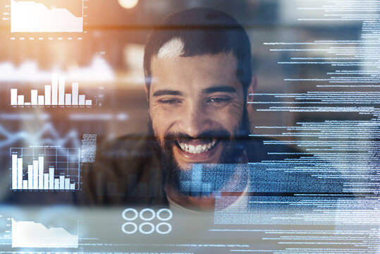 Businessman analyzing financial stock market data on a laptop with a glowing holographic chart overlay representing growth and investment strategies