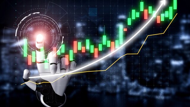 A robotic hand interacts with a digital financial graph, showcasing market growth and analytics in a high-tech urban setting, symbolizing innovation in finance. Copula