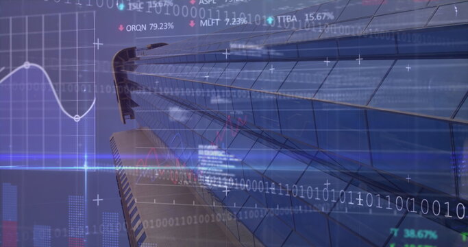 Abstract illustration of a financial growth chart on a glass building. The image combines modern architecture with stock market data, showcasing upward trends and analytics. Copula