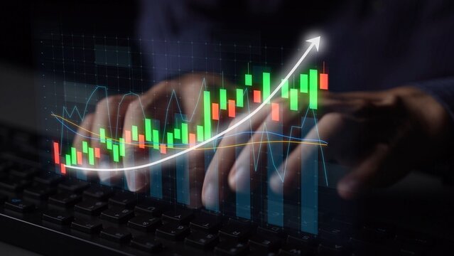 A close-up of hands typing on a laptop keyboard, displaying a digital chart that illustrates the rise of stock market trends in a modern workspace setting. Copula