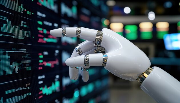 Modern robotic hand reaching out towards digital stock market display in a futuristic environment showcasing technology and innovation during the day