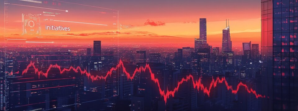 Cityscape at sunset with superimposed stock market graph showing a downturn.
