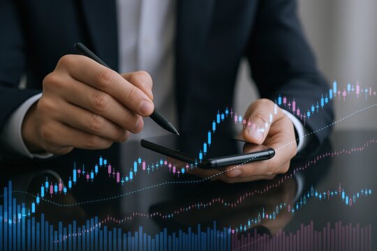 Businessman Analyzing Stock Market Data on Smartphone with Bullish Chart Overlay for Investment Decisions