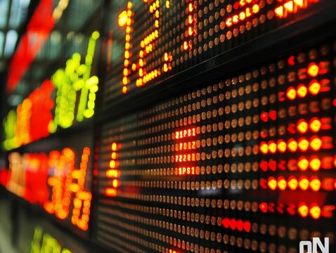 Stock market trading finance investment index ticker exchange data numbers technology market screen shows dynamic trading data with colorful ticker numbers, volatile index movement, urban exchange