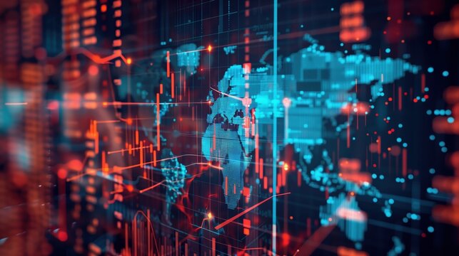 A digital art piece representing global stock markets, with interconnected nodes and lines, world map outlines.