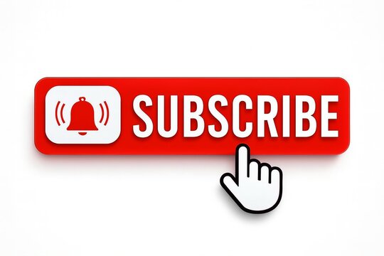 Red subscribe button with notification bell icon and cursor hand pointer on a white background
