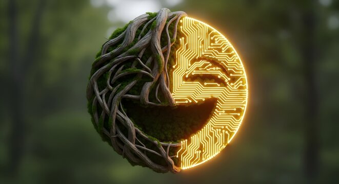 Nature's harmony meets digital innovation: a glowing smiley face symbol seamlessly blending organic roots and vibrant circuit board textures in a serene forest setting, representing eco-tech synergy.