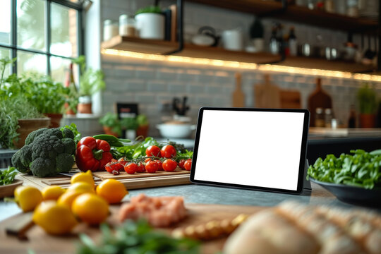 A tablet and smartphone mockup in a modern kitchen setting, offering a versatile template for presenting cooking apps, recipe interfaces, and food-related digital content.  Generative Ai.