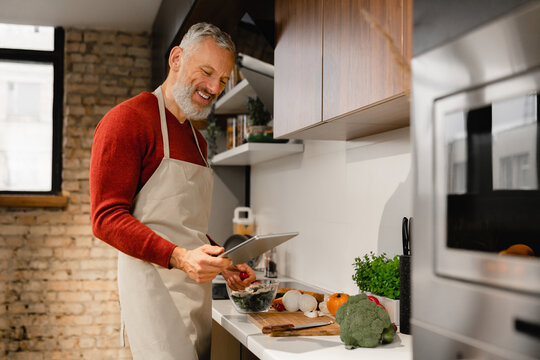 Mature middle-aged man chef cooking, looking for recipe on digital tablet online, preparing vegetable vegan vegetarian salad food meal at home kitchen
