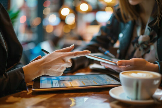 In a cozy coffeeshop setting, two women are collaborating and brainstorming on a project using a tablet
