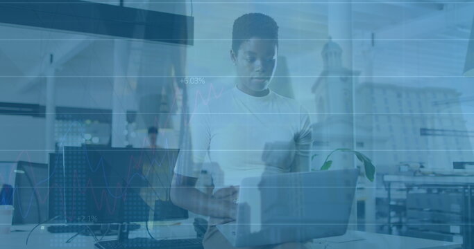 Image of financial data processing over cityscape
