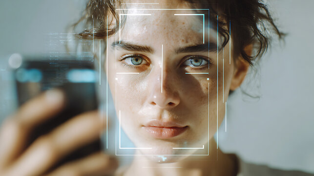 Person Using Smartphone with Facial Recognition Overlay