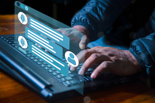A person types on a laptop with a digital chatbot interface overlay, featuring AI conversation bubbles and robotic icons. The image represents AI-powered chatbots and online communication.