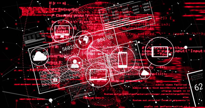Visualizing cloud storage avatar icons and code windows floating on red matrix, with data panels