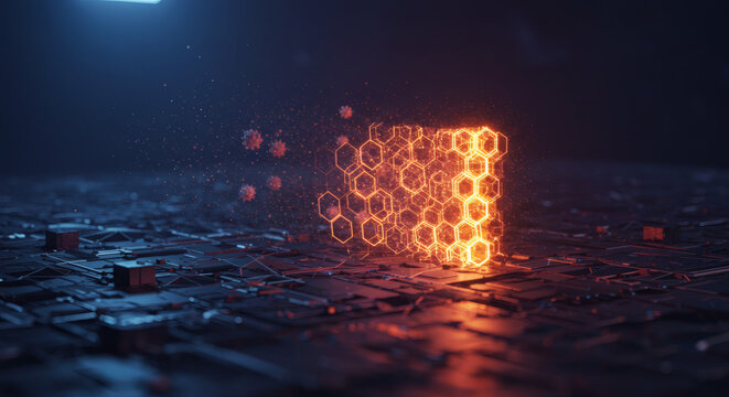 Floating digital network with teal spheres and code