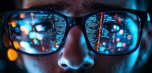 Smiling woman wearing augmented reality cybersecurity overlays showing global hack alerts