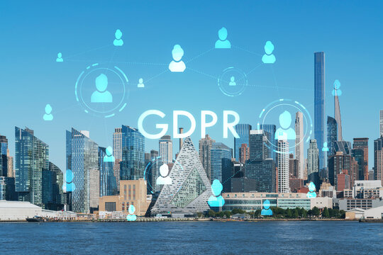 Brooklyn bridge with New York City Manhattan, financial downtown skyline panorama at day time over East River. GDPR hologram, concept of data protection, regulation and privacy for all individuals