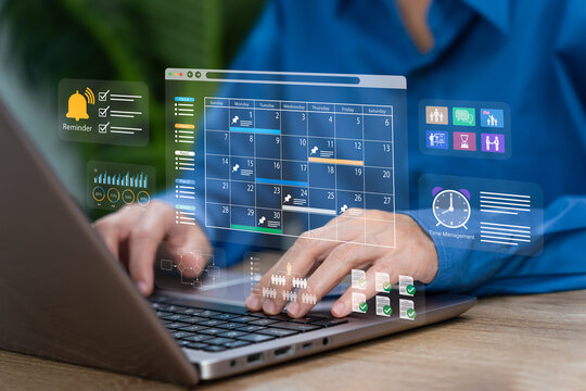 Time Management Alerts Concept, Businesswoman Tracking Calendar Notifications, Daily Schedules, Business Planning Reminders, and Productivity Events Through Smart Digital Tools, Improving performance