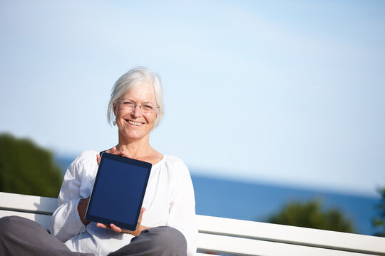 Senior woman, portrait or bench with tablet screen for advertising, marketing or outdoor app. Mature, female person or smile with technology display for tutorial, health tips or mockup at beach