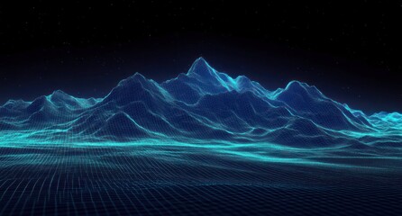 Digital wireframe landscape of mountainous terrain glowing with blue lines under a starry night sky evoking futuristic and technological ambiance