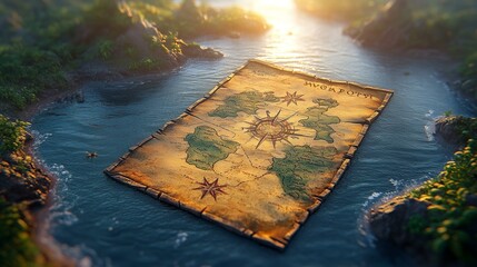 Colorful geometric map representation of a coastal region with polygonal landforms and surrounding water