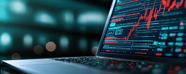 A sleek laptop displays a stock market graph with fluctuating red lines against a high-tech background, suggesting data analysis or financial trading.