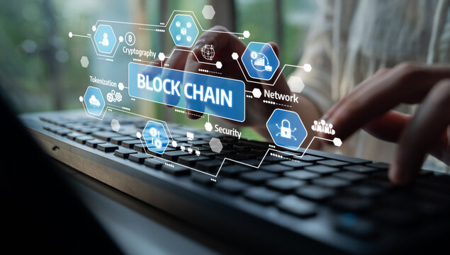 A close-up view of hands typing on a computer keyboard with a blockchain concept overlay showcasing various elements like security and network in a modern office. Tessel