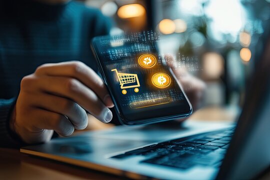 Close-up of hands holding phone, showing shopping cart icon overlayed with digital currency symbols, in front of laptop