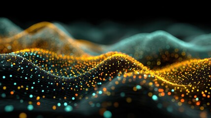 Abstract, wavy, glowing pattern with particles, rendered in shades of orange, yellow, and blue on black