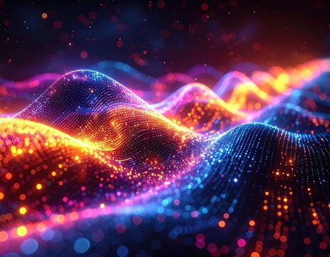 Digital, abstract rendering with glowing, undulating wave patterns in orange, pink, and blue