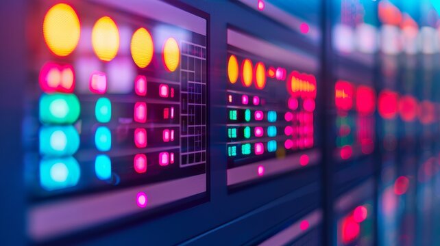 close-up of colorful led lights on server racks in data center, technology infrastructure, digital network, modern server room, high-tech equipment, data processing, cybersecurity, cloud computing, di
