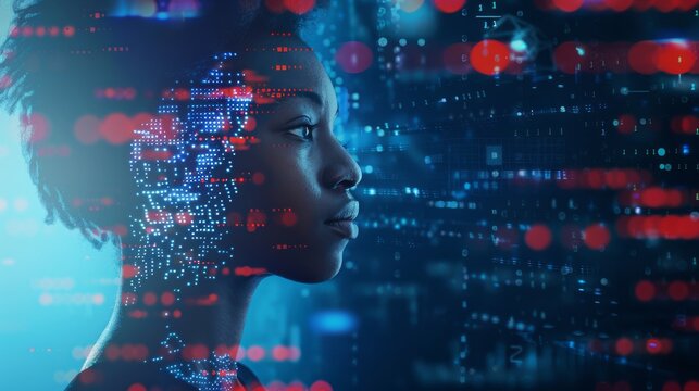 African american woman digital art with blue glowing particles and tech elements. Artificial intelligence and machine learning concept. Female portrait with futuristic effects