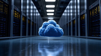 Cloud in a server room symbolizes cloud migration and digital transformation with minimalistic design and bright tone modern blurred empty space for caption