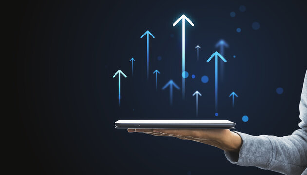Hand holding tablet with rising arrows hologram, depicting growth and digital progress concept