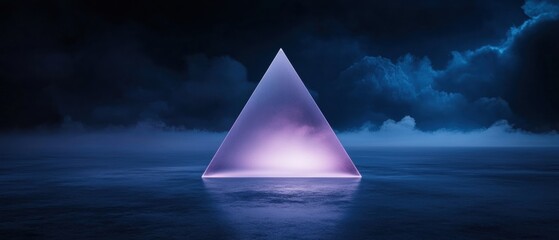 Two neon triangle light frames glowing over a cloudy, dark landscape.