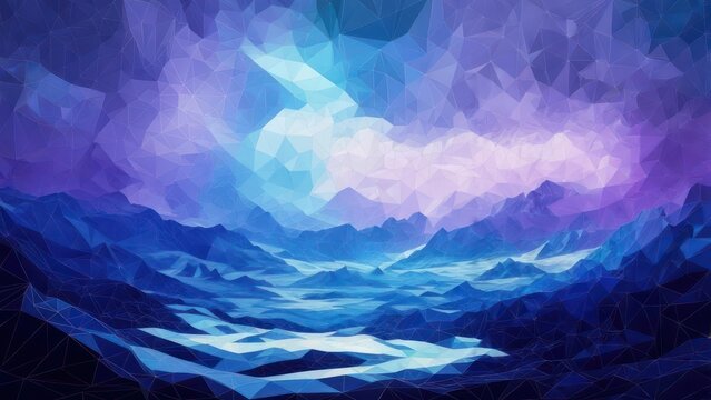 Abstract geometric landscape depicts mountains under a vibrant, polygonal sky with cool tones