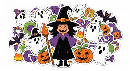 Cartoon witch, ghosts, pumpkins, bats, and candies on white background, creating a fun Halloween design, perfect for cards or decorations