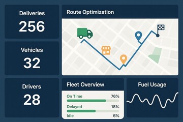 A laptop displaying a map with blue trucks and location markers, illustrating logistics or delivery tracking.