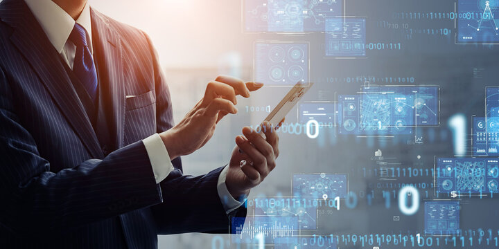 document management concept with icons on virtual screen, ERPBusinessman working on the computer for document management concept, online documentation database, and digital file storage system.