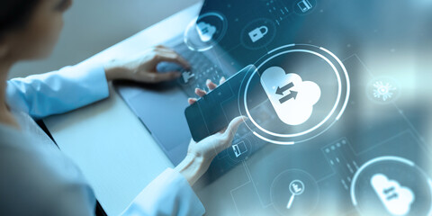 Cloud uploading and data transfer. A businessman uses a digital touchscreen and smartphone in a modern office to upload and sync files securely through cloud technology for business workflow.