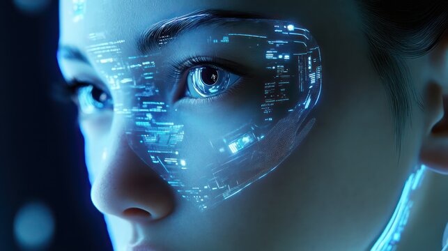 Woman's portrait displaying a digital overlay measuring biometric facial data on a dark background