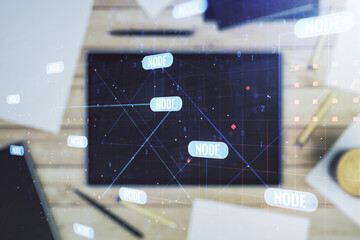 Double exposure of abstract programming language hologram and digital tablet on background, top view, research and development concept