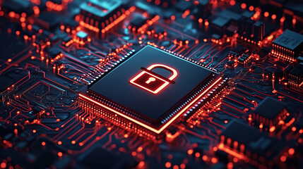 3D rendering of an icon on a chip with a padlock symbol floating over a computer circuit board background