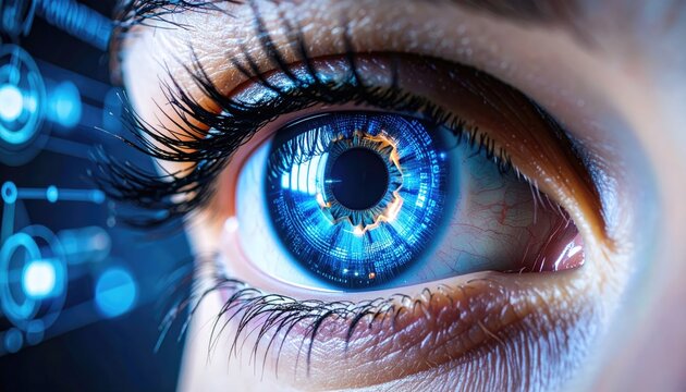 A close-up of a human eye with digital data overlay, showcasing futuristic technology and human-computer interaction.